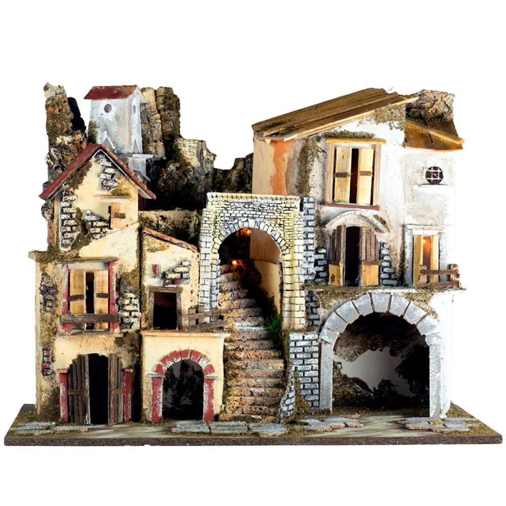 Completa il tuo Presepe Natalizio con il Borgo Presepe con Luci 60x34x44 cm, realizzato artigianalmente con finiture in legno, muschio e sughero. Il borgo è una riproduzione realistica di tante case addossate con una scala centrale, è dotato di luci ed è perfetto per essere inserito nel tuo presepe. Il Borgo Presepe con Luci ha uno spazio interno che le consente di ospitare personaggi per ricreare le tue scene preferite e dare sfogo alla tua fantasia compositiva!