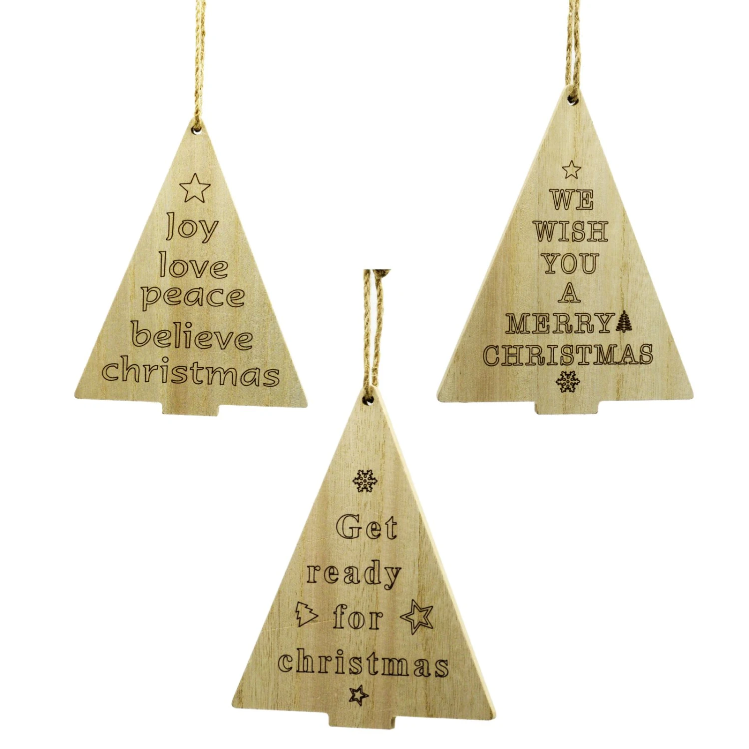 Decorazione a forma di Albero stilizzato, realizzata in Legno, con scritte in inglese relative al Natale.