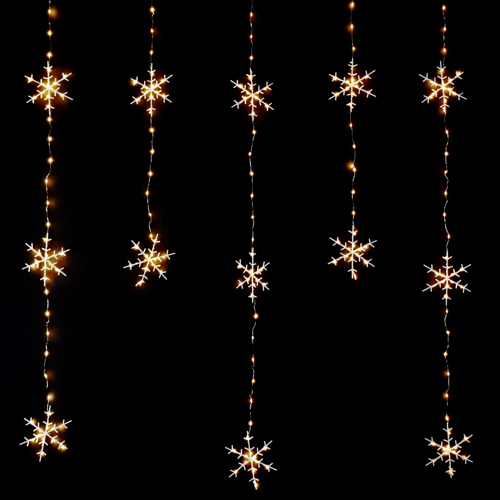 La Tenda Luminosa Pioggia di Fiocchi di Neve, 234 Nanoled, 1 metro, Luce Calda fissa, timer, IP44 di Prequ è una tenda di luci di Natale di 1 metro dotata di 234 nano led a luce calda fissa. Fili pendenti si alterano su due lunghezze differenti per un massimo di 1,20 m, le cui estremità presentano fiocchi di neve luminosi larghi 15 cm.