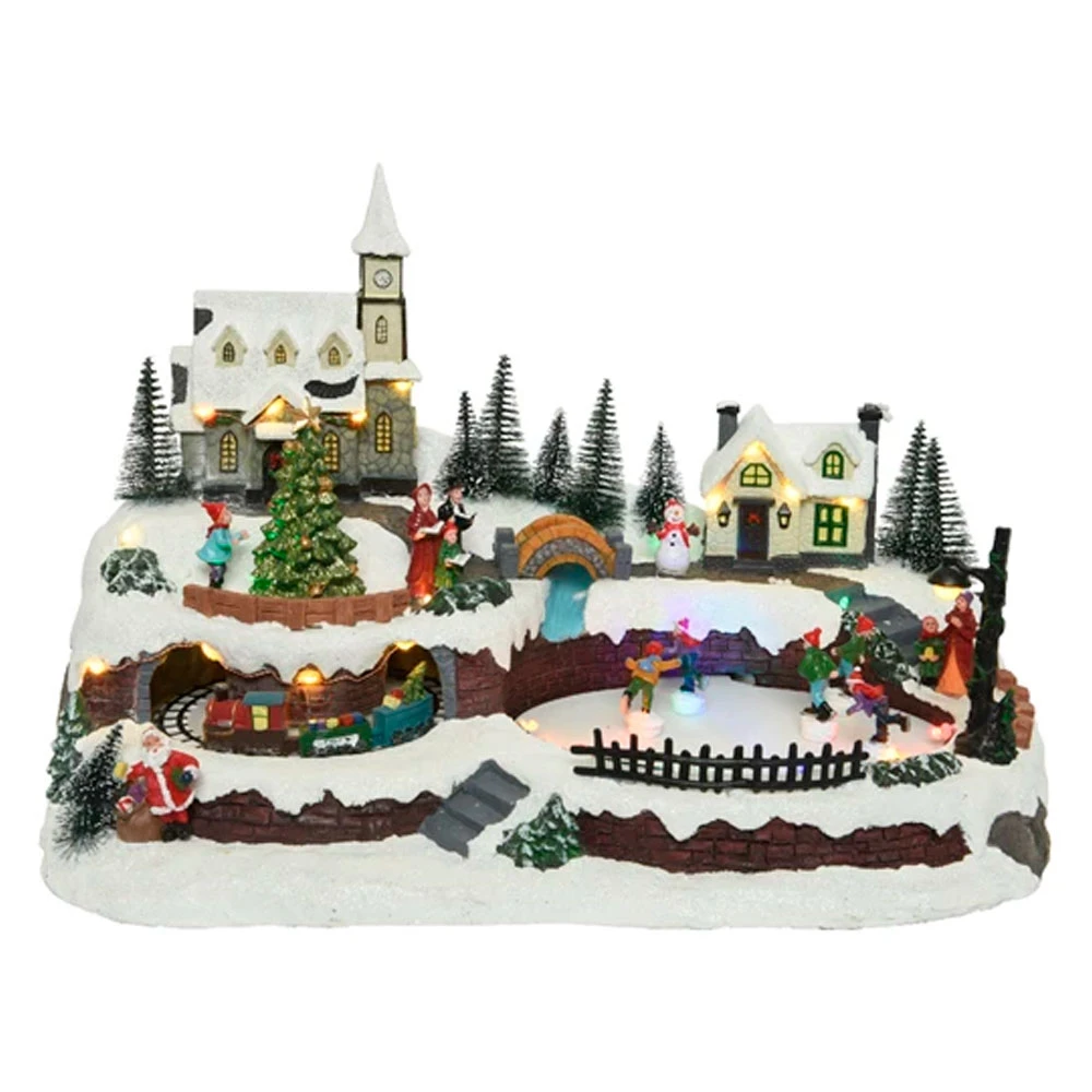 Il Villaggio Natalizio con Luci a LED Musica e Movimenti 41 cm è una scenetta natalizia con luci a LED multi color, suoni e movimenti. Il Villaggio Natalizio con Luci a LED Musica e Movimenti dà subito un tocco di magia natalizia al tuo arredamento interno! Il Villaggio rappresenta un paesaggio innevato con una casa e una chiesa, una pista da pattinaggio in movimento e un trenino! Sotto la chiesa c’è un coro che canta attorno all’albero di natale in movimento.