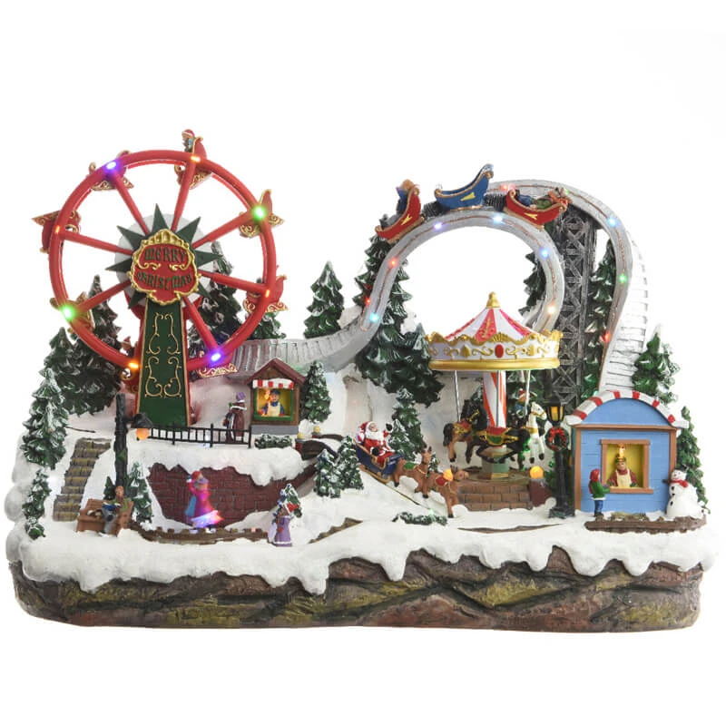 Il Villaggio Natalizio Fiera con Giostre della Kaemingk è adatto per creare un decoro unico, ravvivando l’ambiente con luci festive, musica natalizia e movimento. E’ ideale come arredo natalizio per vetrine, attività commerciali o semplicemente per rendere più accogliente e calda la tua casa durante le feste. E’ illuminato da luci a LED multicolore e può essere facilmente posizionato in qualsiasi punto della casa.